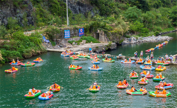下午在徒步過后陶總還帶領大家體驗了刺激的大別山漂流,大約2個小時的漂流路線,大家感受了一次激流勇進的刺激,大家兩兩一船,時而劃船,時而潑水打鬧,玩的非常酣暢淋漓。